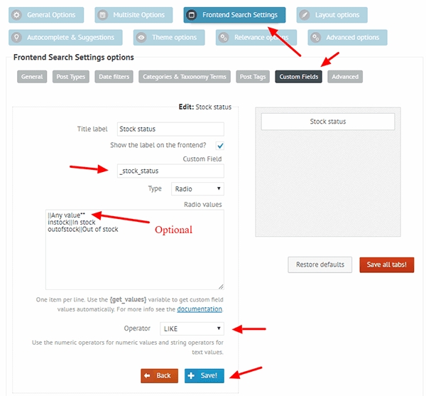 To the Custom Field input enter: _stock_status