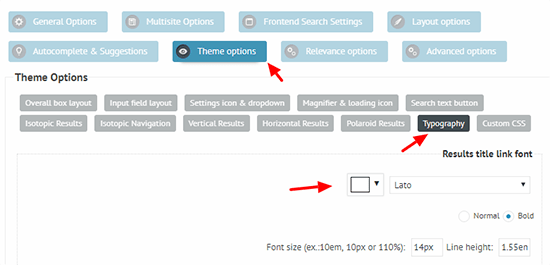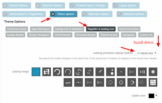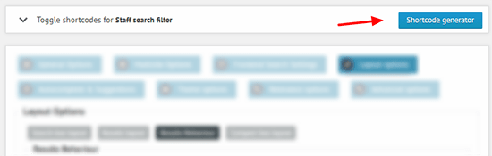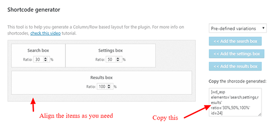 The plugin has a built in shortcode builder feature, which allows you to make a custom layout for each search element: search bar, settings and results box. To access this feature, click on the Shortcode Generator button on the search instance settings page.