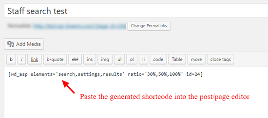 Copy the shortcode generated, and paste it into the page where you want the search filter to be displayed.