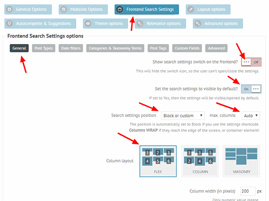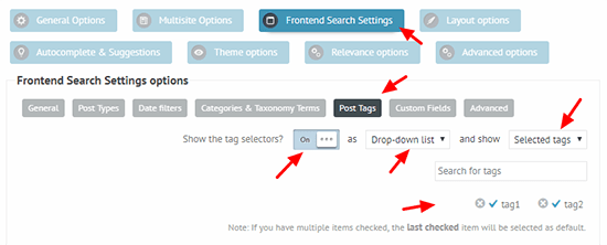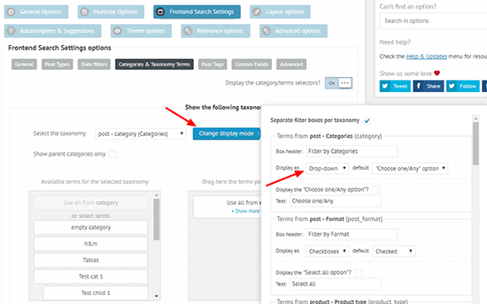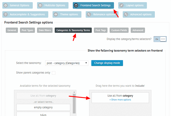 Now, let us create two filters. I have decided to use two separate filters, one for categories and one for tags. To create the category filters, go to the Frontent Search Settings -> Categories & Taxonomy terms panel.