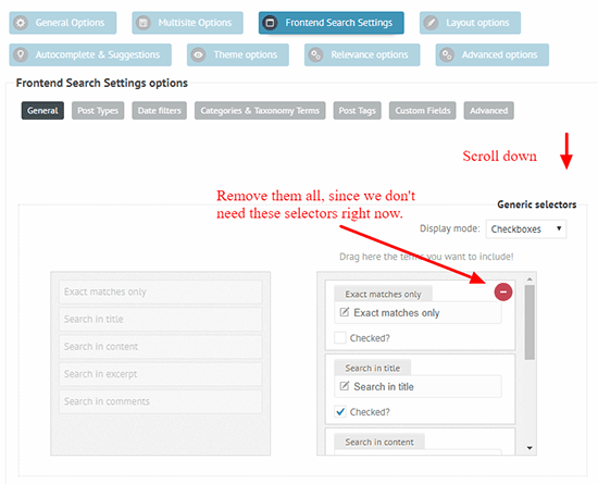 Since we don’t want any generic selectors (like exact matches, search in content etc..), just remove them on the same panel as before (scroll down), by clicking on the (-) button on each item.