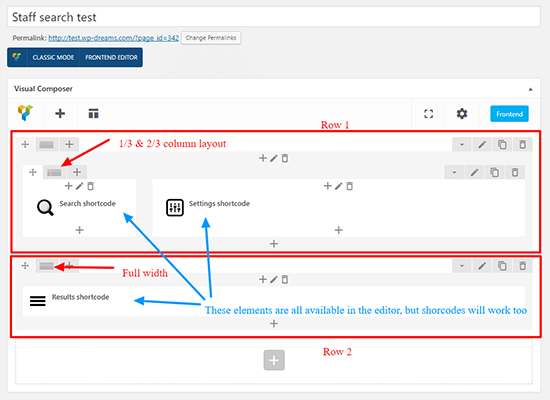 If you use a different page editor, don’t worry, it definitely supports shortcodes. So basically you can simply place the search, settings and the results shortcodes to these rows, like so: