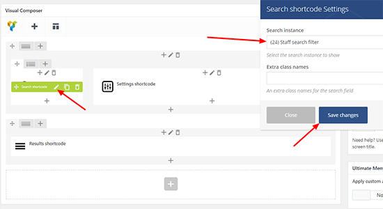 Placed the Search shortcode element to the first column (Row 1), the Settings shortcode element to the second column (Row 1) and Results shortcode element to the full-width Row 2.