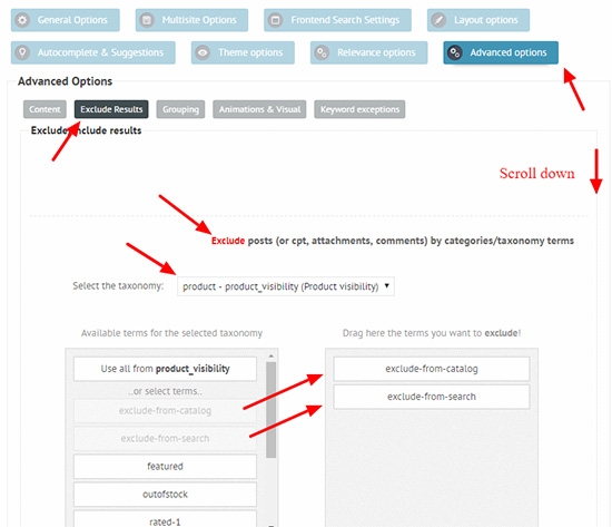 Drag the exclude-from-catalog and the exclude-from-search items to the right side, so products that are hidden from the catalog as well as from the search will be excluded.